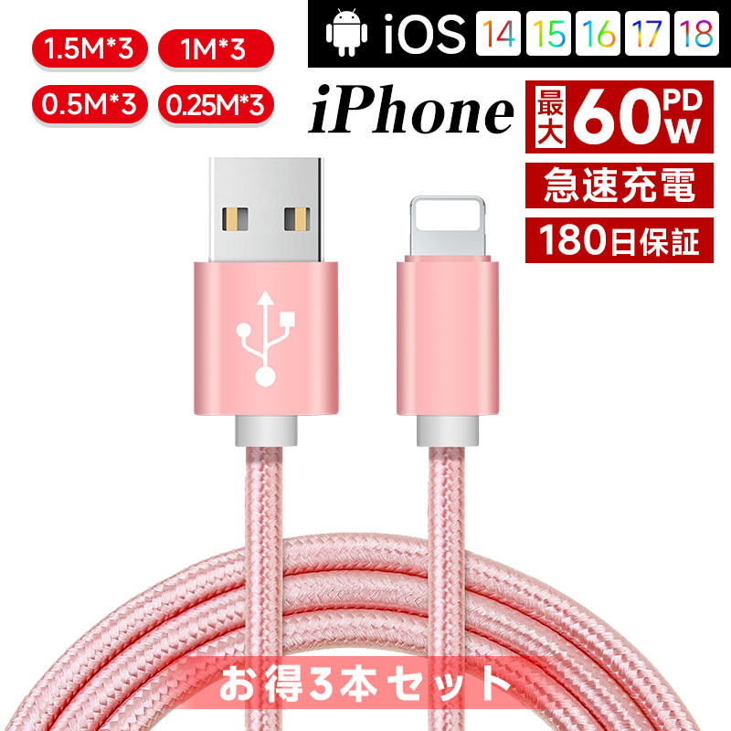 【3本セット】iPhoneケーブル 長さ 0.25m 0.5m 1m 1.5m 急速充電器 iPhone17 Air 16Pro 15 14 13mini 12 11 XS max XR X 8 7 データ伝送 iPad【PL保険済み安心】