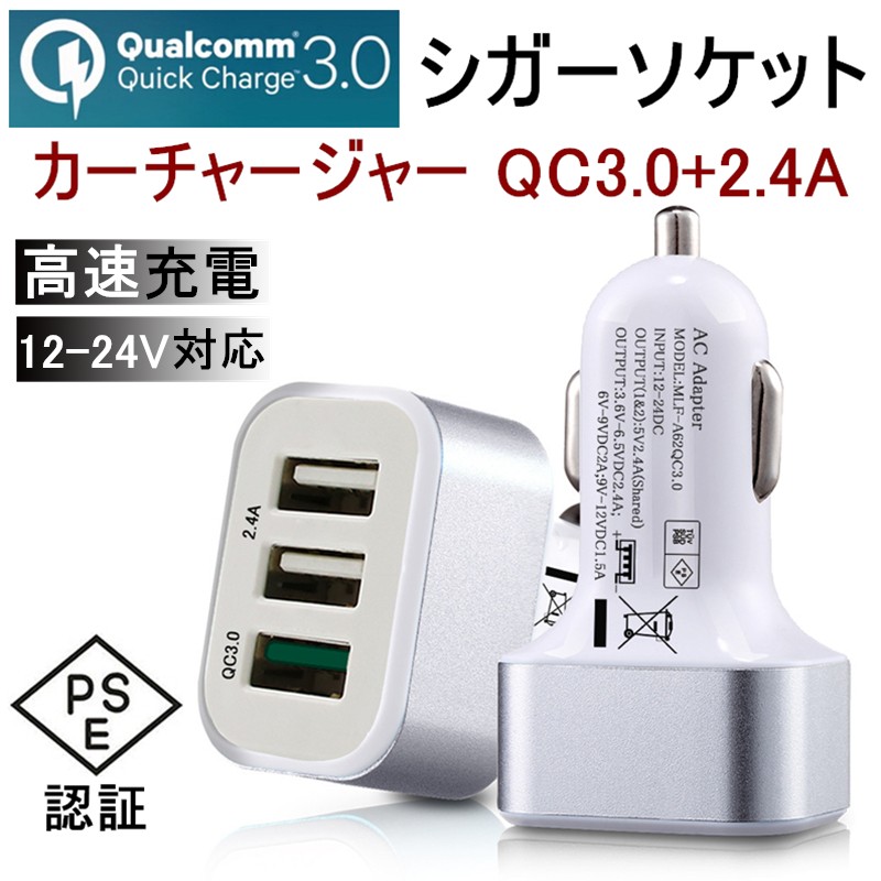 ACアダプター Quick Charge3.0 カーチャージャー USB急速充電 2.4A超高出力 USB3ポート iPhone17/16 車載用 ACコンセント PSE認証【PL保険加入済み製品・安心】