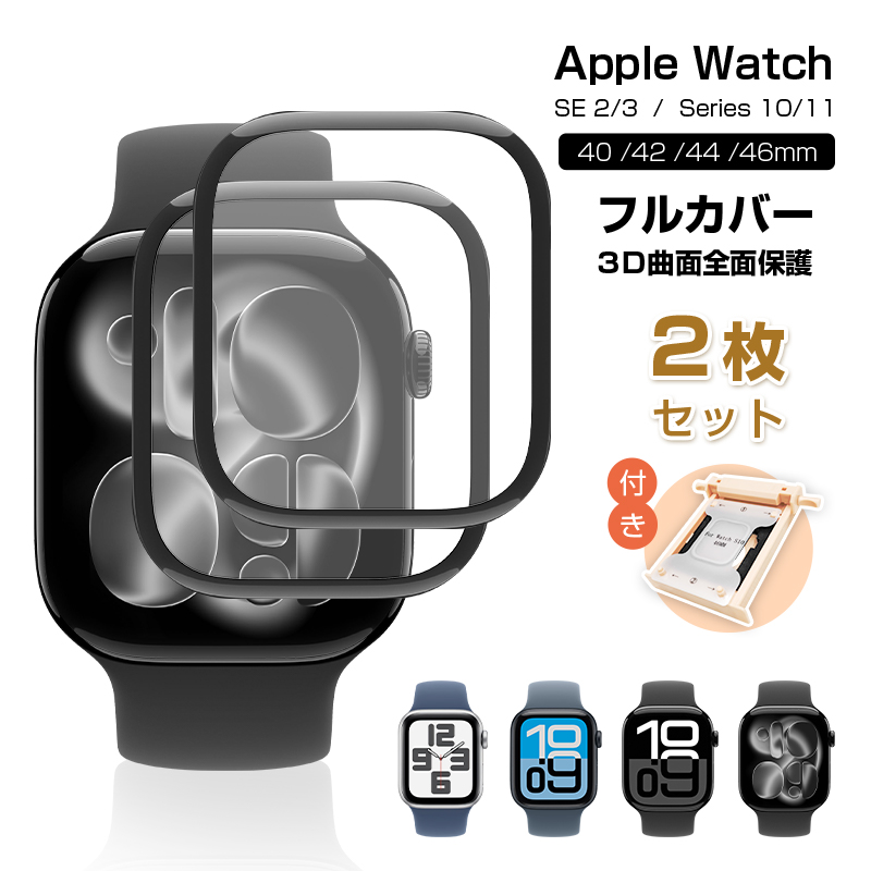 【2枚セット】 Apple Watch SE2/SE3 全面保護フィルム Apple Watch Series10/Series11 ガイド枠付 46mm 44mm 42mm 40mm 衝撃吸収 ソフトフィルム 3D熱曲げ加工