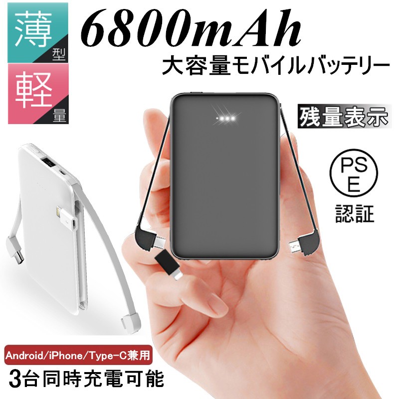 6800mAh モバイルバッテリー 超軽量 ケーブル内蔵 ミニ型 防災電源 薄型 3台同時急速 各機種対応 コンパクト iPhone17充電 PSE認証【PL保険加入済み製品・安心】