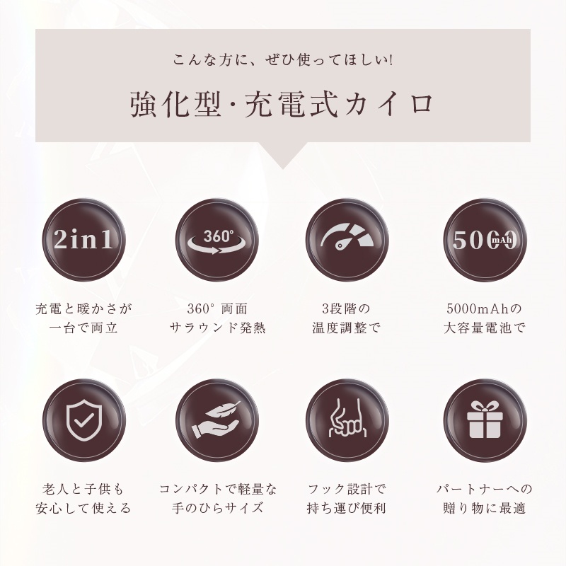 この「ポーチスタイル」電気カイロは、単に手を温めるという機能だけでなく、デザイン性、携帯性、そしてユーザー体験までを含めた総合的なパフォーマンスを提供する製品です。洗練された大人のファッションとして、日常のちょっとしたアクセントに、そして実用的な防寒アイテムと充電グッズとして、幅広いシーンでご利用いただけます。本品は、日常に彩りと温もりを添える、こだわりの逸品です。