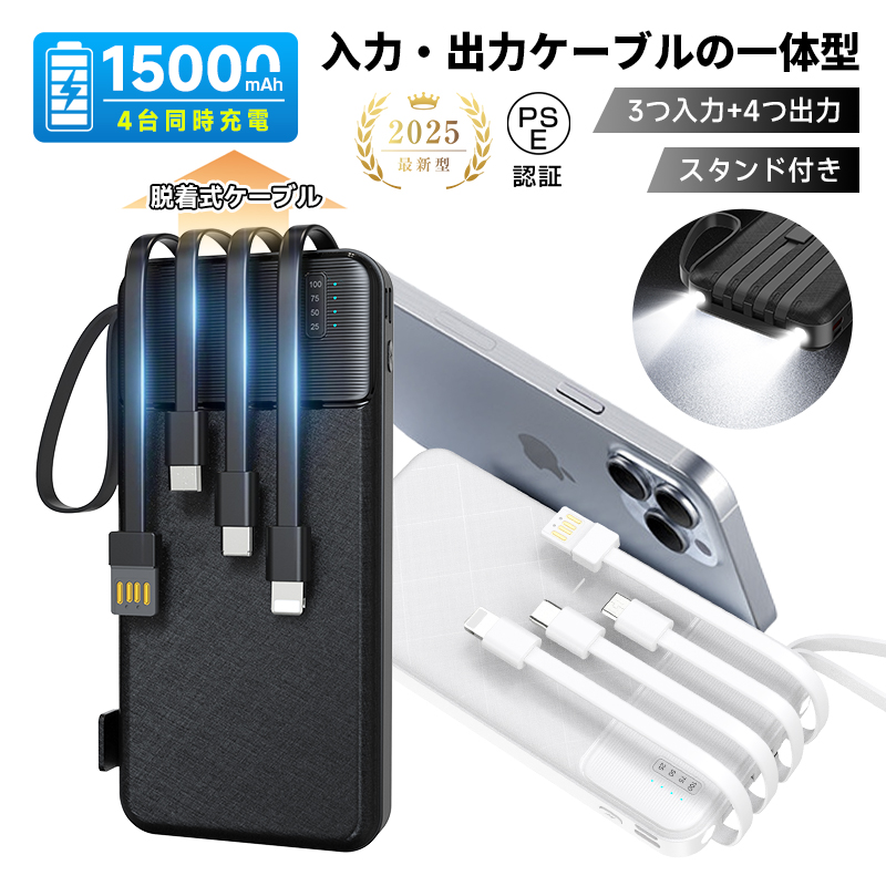充電機能では複数の出力ケーブルとUSB-A出力ポートを装備し、4台のデバイスを同時に充電可能です。内蔵LEDライトは、暗所での作業や非常時の照明として活用できます。また、内蔵のケーブルは、着脱式で、抜き取って、他のデバイスと組み合わせて使用できます。更に、折りたたみ式スタンド機能により、充電中のデバイスを安定して置くことができ、動画視聴やビデオ通話にも最適です。