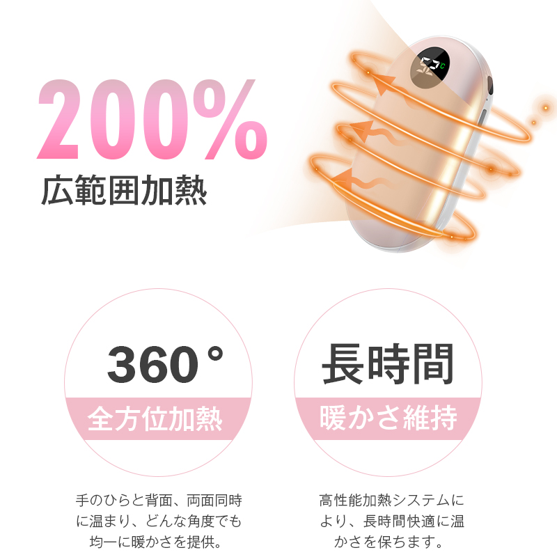 1.低温(約42°C)、中温(約47°C)、高温(約52°C)の3段階で、シーンに合わせた快適な暖かさを提供。即暖技術により、起動後すぐに温まり、寒冷地や屋外でも瞬時に手を温めます。ボタン操作で温度を簡単に切り替え、LEDディスプレイで設定を明確に表示します。