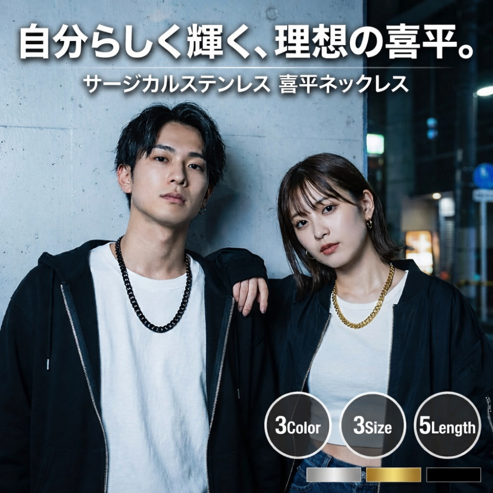 圧倒的なバリエーション: 太さは3種類、長さは5種類から選択可能。細めで上品に、太めでストリートに、あなたのスタイルに合わせて選べます。