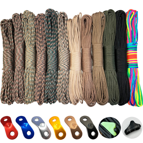 ※切り口はライター等で炙ると容易に末端処理ができます。アルミ自在金具は、色褪せなく、調整しやすく、テントやタープのロープ調整にご利用頂けます。