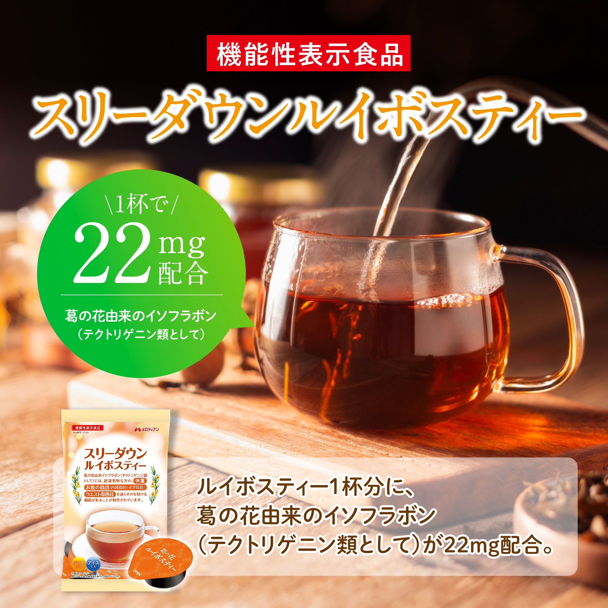 液体濃縮ルイボスティー 水やお湯、炭酸で割って簡単においしいルイボスティ―ができる。葛の花由来のイソフラボン(テクトリゲニン類として)22mg配合。