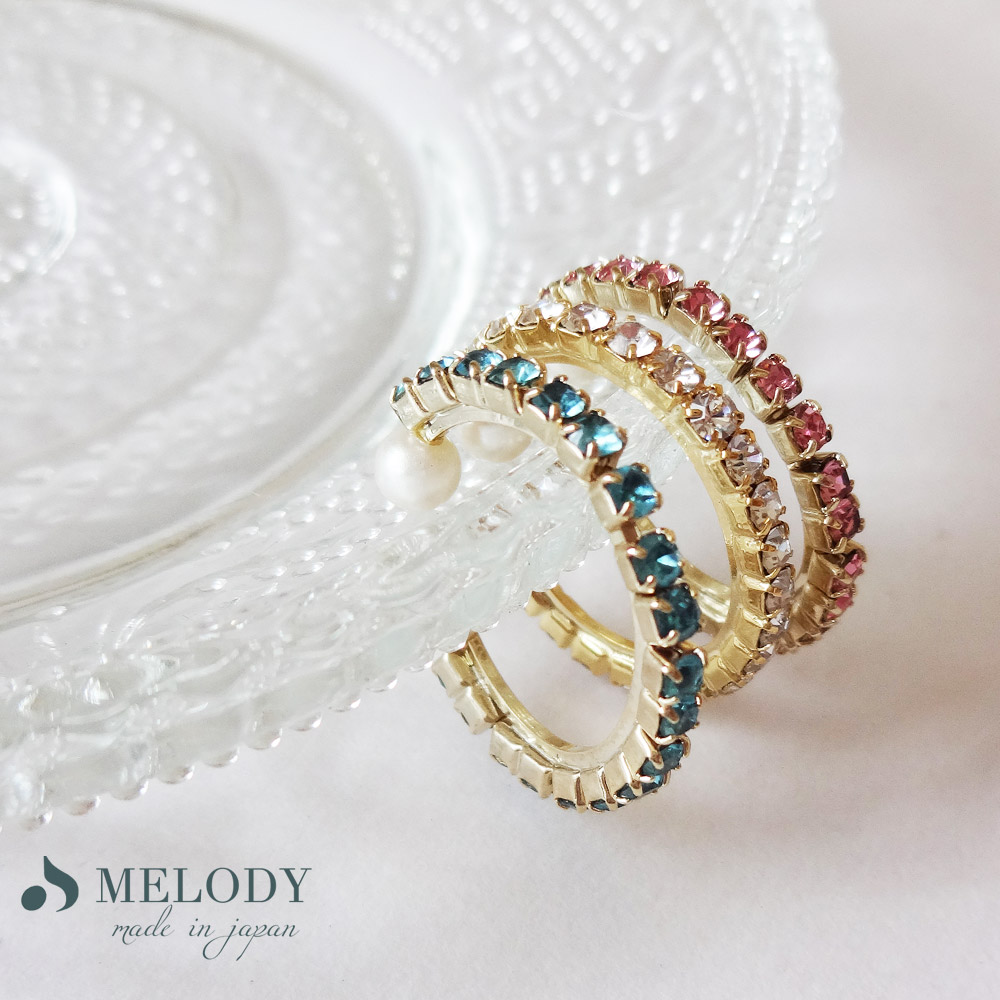 カラフルな3色のラインストーンが耳元のアクセントに。