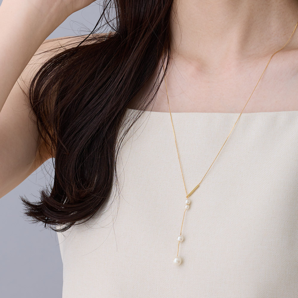 異なるサイズのパールと、メタルバーがバランスよく設計されたラリエットネックレス。