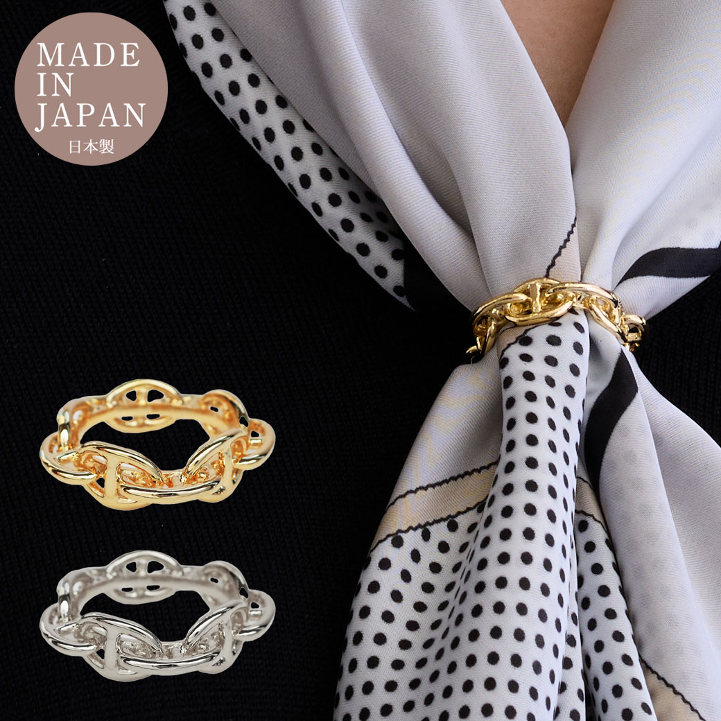 日本製アンカーチェーンのスカーフリング。さっと通すだけで美しく留まり、忙しい朝にも便利。ゴールドとシルバーの2色展開で、ギフトにも喜ばれる上質アイテム。