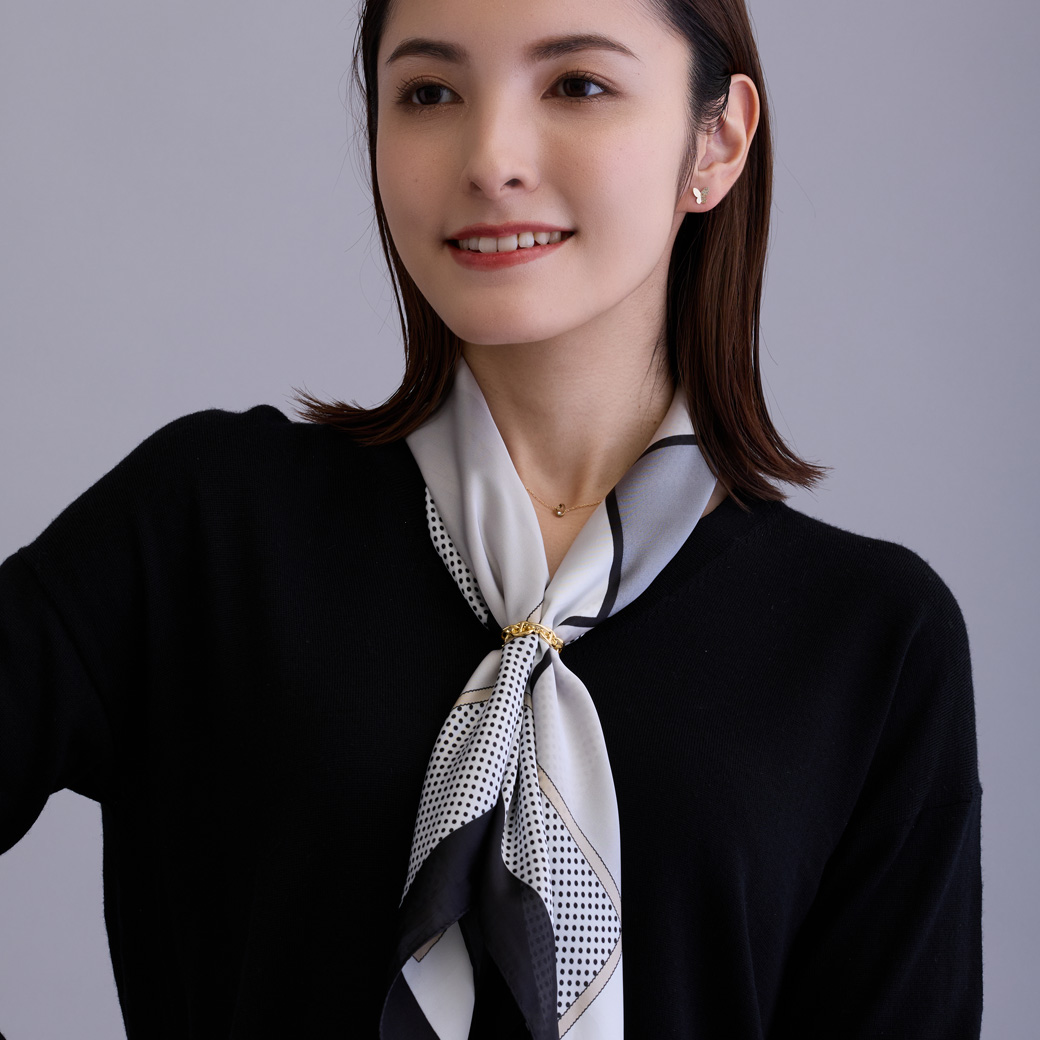 リングにさっと通すだけでスカーフを留められる便利さも魅力。