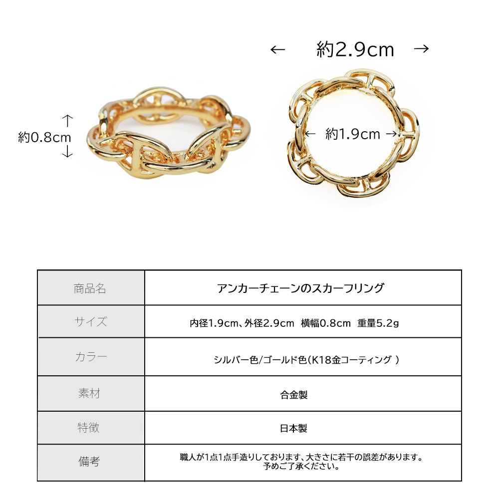【特徴】日本製アンカーチェーンのスカーフリング。さっと通すだけで美しく留まり、忙しい朝にも便利。ゴールドとシルバーの2色展開で、ギフトにも喜ばれる上質アイテム。