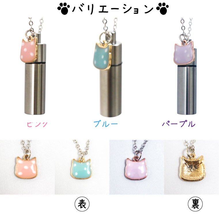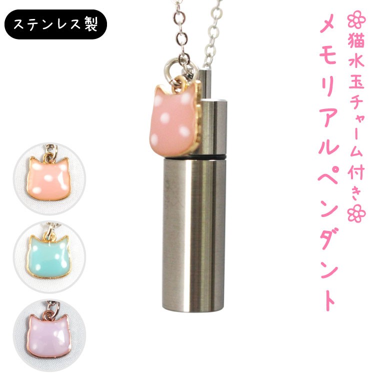 遺骨ペンダント メモリアルペンダント ステンレス ネコチャーム付き 水玉 ネコ 生活防水 ガラス管入
