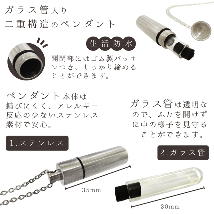 ご遺骨などが納められるご遺骨ペンダント。ステンレス製ですので、安心してご利用いただけます。