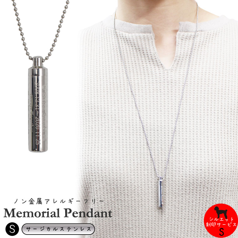 遺骨ペンダント サージカルステンレス 筒型 サイズS ロケットペンダント メモリアルペンダント ボールチェーン ネックレス【刻印入り】シルエット