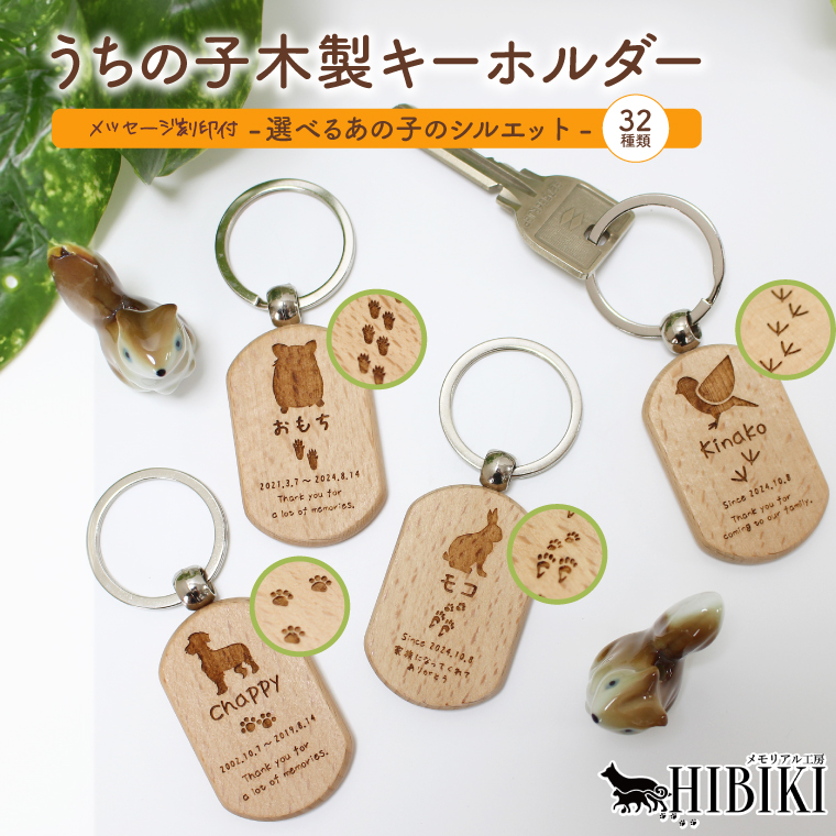 キーホルダーにはペットのシルエット、お名前、足あと、日付、メッセージをお入れします。