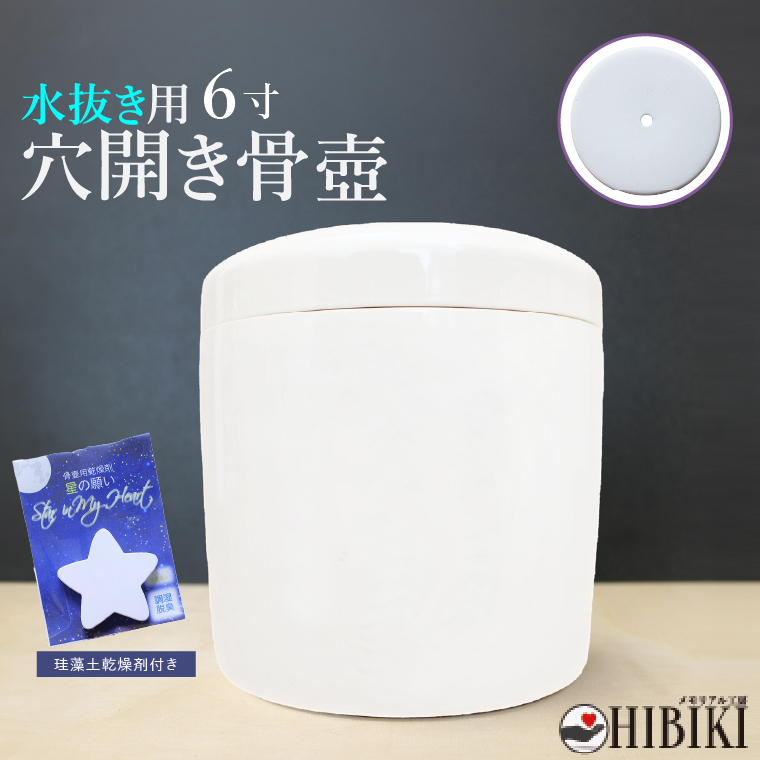 穴開き 骨壷 切立 ホワイト 水抜き カビ 湿気 防止 水が溜まらない 土葬 埋葬 供養 珪藻土乾燥剤付き 6寸