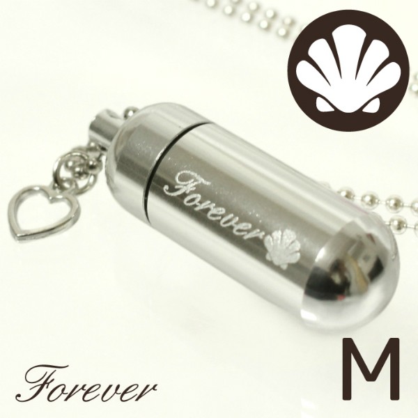 ご遺骨などを納めることのできる、イラストマークとforeverの文字が入った遺骨カプセル、遺骨ペンダントです。こちらはオープンハートチャームつきとなります。