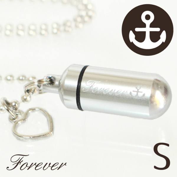 ご遺骨などを納めることのできる、マリンな錨のマークとforeverの文字が入った遺骨カプセル、遺骨ペンダントです。お守り袋+ホルダーフックつき。