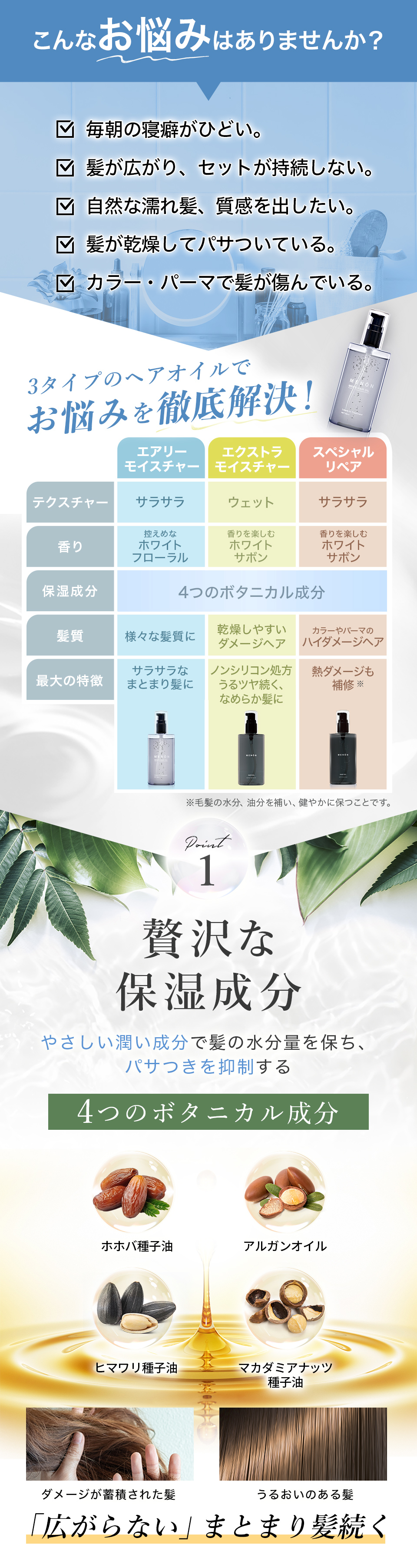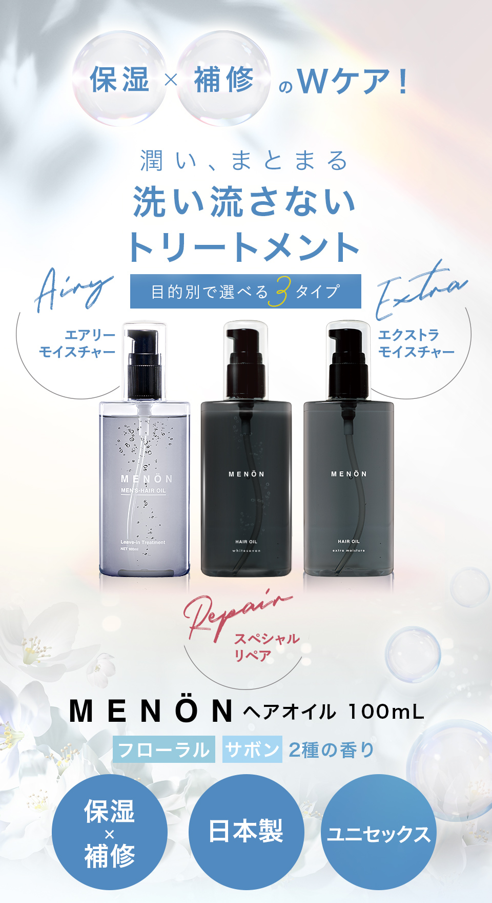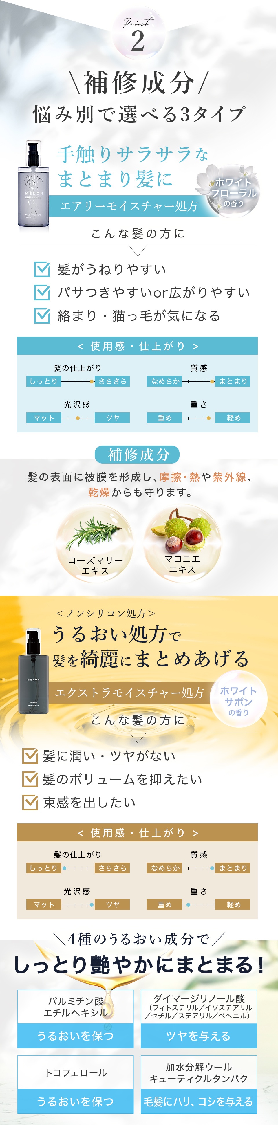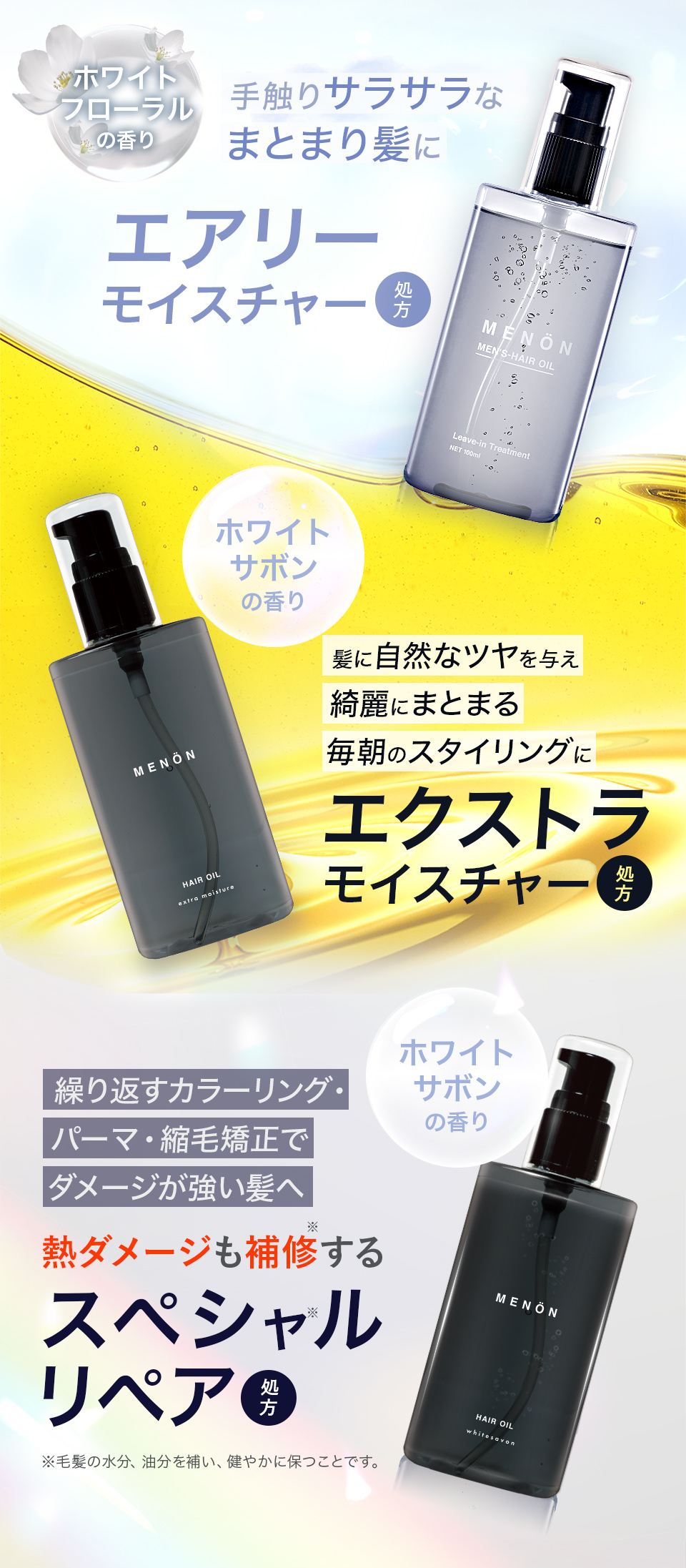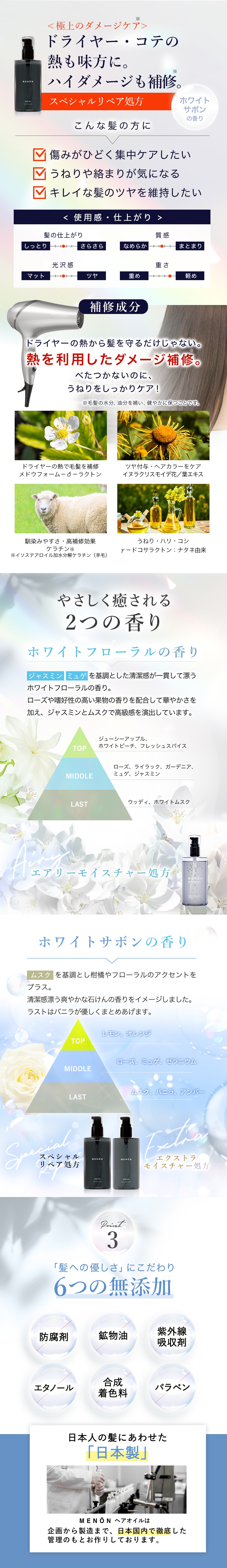 | 成分 | 【エアリーモイスチャー処方(ホワイトフローラルの香り)】 シクロペンタシロキサン、ジメチコノール、ジメチコン、パルミチン酸エチルヘキシル、ホホバ種子油、マカデミア種子油、ローズヒップ油、ブドウ種子油、アルガニアスピノサ核油、マロニエエキス、ローズマリー葉エキス、ヒマワリ種子油、香料 【エクストラモイスチャー処方(ホワイトサボンの香り)】パルミチン酸エチルヘキシル、ダイマージリノール酸(フィトステリル/イソステアリル/セチル/ステアリル/ベヘニル)、ホホバ種子油、香料、トコフェロール、ヒマワリ種子油、マカデミア種子油、アルガニアスピノサ核油、水、イソノナン酸イソノニル、イソステアロイル加水分解ケラチン(羊毛)、加水分解ウールキューティクルタンパク 【スペシャルリペア処方(ホワイトサボンの香り)】 シクロペンタシロキサン、ジメチコン、香料、ジメチコノール、トリ(カプリル酸/カプリン酸)グリセリル、ラウロイルグルタミン酸ジ(フィトステリル/オクチルドデシル)、ホホバ種子油、ブドウ種子油、ヒマワリ種子油、アルガニアスピノサ核油、マカデミア種子油、メドウフォーム−δ−ラクトン、シクロヘキサン−1,4−ジカルボン酸ビスエトキシジグリコール、カニナバラ果実油、イソノナン酸イソノニル、イソステアロイル加水分解ケラチン(羊毛)、イヌラクリスモイデ花/葉エキス、γ−ドコサラクトン、トコフェロール |