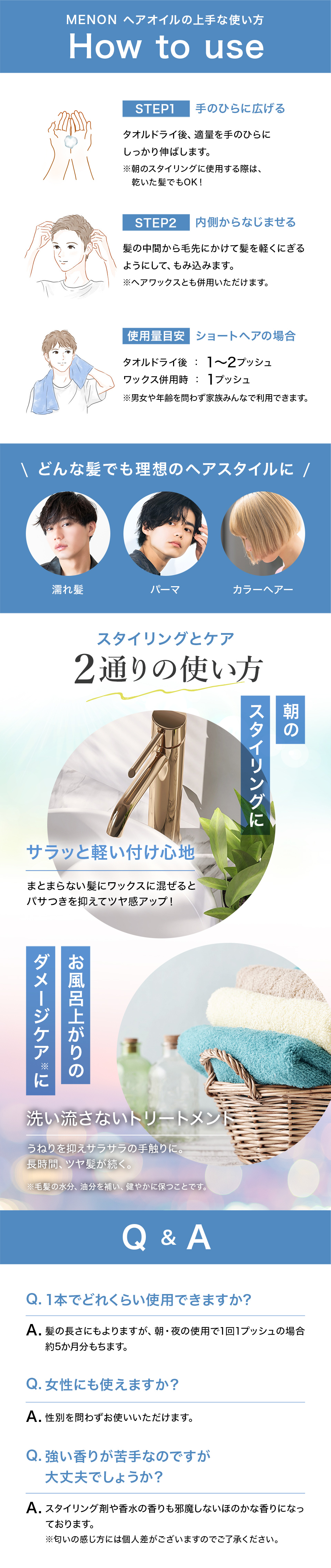 | 使用方法 | タオルドライ後、適量を手のひらにのばし、毛先を中心に髪全体になじませ乾かします。ヘアワックスとも併用いただけます。 【使用量の目安】 ショートヘア:タオルドライ後1~2プッシュ ワックス併用時:1プッシュ |