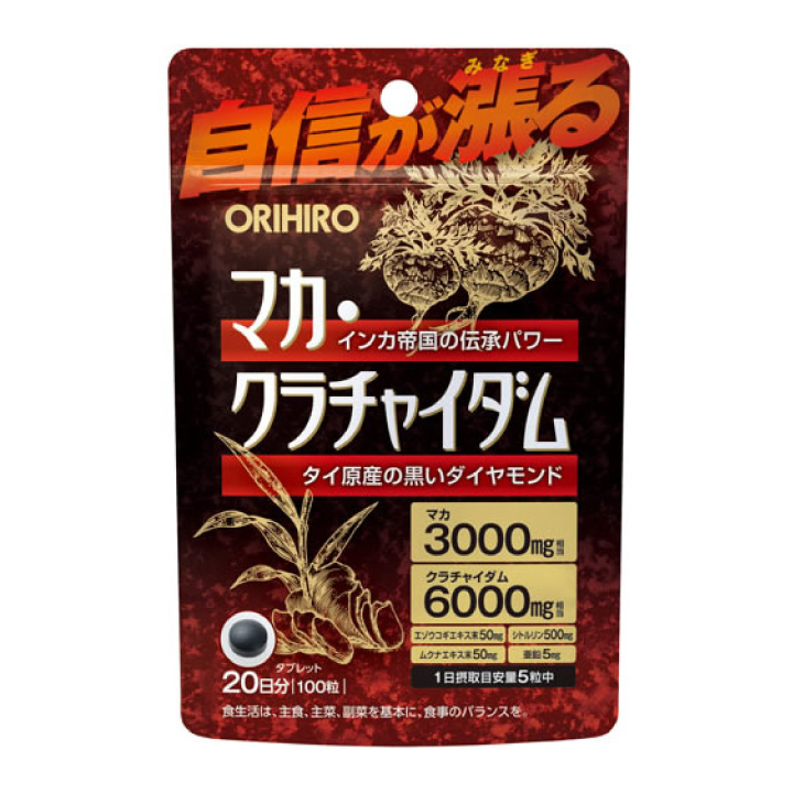 | 主成分配合量/製品5粒中 | マカエキス末150mg(マカ3000mg相当)、クラチャイダムエキス末100mg(クラチャイダム6000mg相当)、エゾウコギエキス末50mg、ムクナエキス末50mg、シトルリン500mg、ビタミンB1 7.2mg(600%)、ビタミンB6 3.0mg(231%)、亜鉛5.0mg(57%) |
