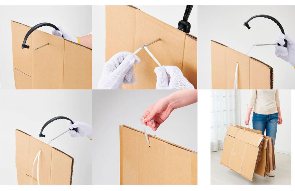 | 使用方法 | 突き刺し位置は上から5cm辺りが目安です。 上すぎると段ボールが破れてしまう恐れがあります。 ・そのまま持ち運ぶ場合:先端を段ボールに突き刺してロックするだけ! ・紐を通す場合:段ボールに突き刺したら先端のフックに紐を掛けて引くだけ! |