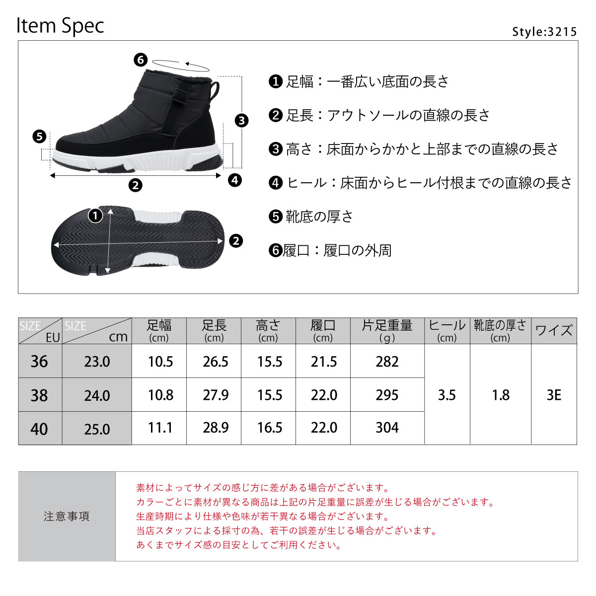 | サイズ | 23.0cm(EU36) 24.0cm(EU38) 25.0cm(EU40) ワイズ:3E(EEE)相当 ヒール:約3.5cm |