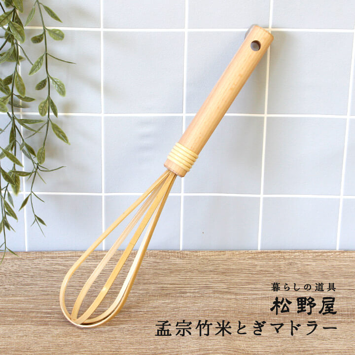 | お米に優しい、竹製の米研ぎ用マドラー 竹のもつ「しなり」と「弾力」の特徴を活かしたマドラーで、お米をつぶさずにとぐことができ、 炊飯器の内釜も傷つけにくいのが特徴です。 持手は木製で作られており、金属製ではない自然素材ならではのナチュラルな風合いが魅力です。 お米とぎにはもちろん、卵を溶いたりホットケーキなどの生地を混ぜる際にも重宝します。 手荒れが気になるとき、冷たい水で手を濡らしたくない寒い時期の家事も快適に! |