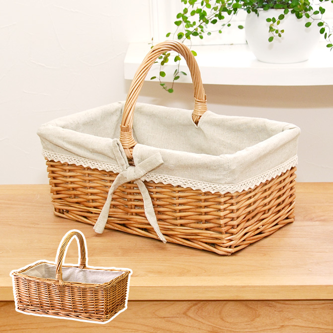 | 【外寸サイズ(約)】 W:33cm×D:21cm×H:14cm/持ち手込H:28cm | 商品材質 かご:ウィロー(煮柳) 布:リネン(麻) |