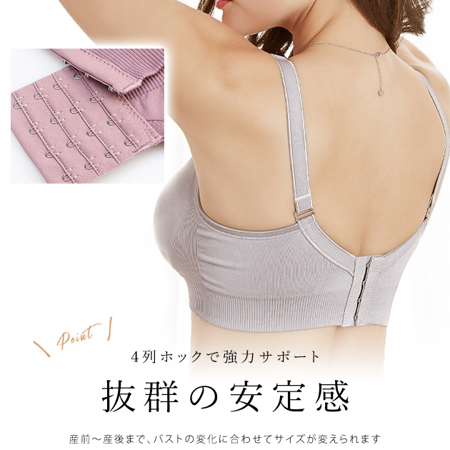 | サイズ(cm) | Sサイズ (参考:妊娠前サイズ 65A〜65D、70A〜70C) Mサイズ (参考:妊娠前サイズ 70A〜70E、75A〜75C、80A〜80B) Lサイズ (参考:妊娠前サイズ 70F〜70G、75D〜75G、80C〜80D、85B〜85D) XLサイズ (参考:妊娠前サイズ 80E〜80G、85E〜85G、90B〜90E、95B〜95D、100A〜100D) |
