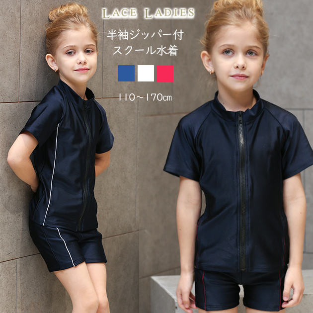 女児 半袖 前ジッパー セパレート スクール水着 ガールズ 女子 上下別 ハーフパンツ フィットネス 女の子 水着 ジュニア 110 120 130 140 150 160 170