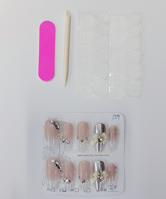 | ■商品説明 爪先をラメで飾った、フレンチデザインのネイルチップ。 クリア感のあるベースで重くなりすぎず、華やかながらもナチュラルにお使いいただける配色が魅力です。 アクセントにはビジューやリボンの立体モチーフをあしらい、キュートな存在感をプラス。 トレンドのミラー風カラーも入れることで、ドレッシーな雰囲気に仕上げています。 シールタイプなので着脱がしやすく、不器用さんにもトライしやすいのがうれしいところ。 特別なシーンのアクセサリーとしても活躍してます。 ■セット内容 ・ネイルチップ 10枚 ・粘着シール 24枚 ・ネイルファイル 1個(色ランダム) ・ウッドスティック 1個(色ランダム) 1個 ■素材 ウレタン樹脂 ■使用方法 (1)消毒用エタノール等で爪の油分や汚れをふき取る (2)粘着グミタイプ:適切なサイズの粘着グミを爪に貼り、表面フィルムを剥がす グルータイプ:ネイルチップの裏側に適量にグルーを塗る (3)爪の根元からネイルチップを付ける (4)20秒ほど押さえてフィットさせる ■長持ちの秘訣 ・ネイルチップを貼る前に、反射点やグリースがなくなるまでネイルファイルで爪を磨きます。 ・爪よりも少し小さめのネイルチップをお選びください。 ・粘着グミが温かいと粘着性が高くなります。寒い時期はドライヤーなどで温めてからご使用いただくとより効果的です。 ・ネイルチップと爪の間の空気を抜くように指でギュッと押さえると、さらにしっかりと密着します。 ・効果を長持ちさせるため、粘着後2時間は水に触れないようにしてください。 ■外し方 ウッドスティックを自爪とチップの間に少しずつ差し込み、ゆっくりと剥がしてください。無理やり剥がすと爪が痛む原因となります。 ※剥がしにくい場合は、外す前に指をぬるま湯に5?10分程浸すか、ウッドスティックにオイルなどを含ませてから行うと効果的です。 ■原産国 MADE IN CHINA ■注意事項 ・撮影画像と実物の色合いが多少異なって見える場合がございます。 ・サイズは平置きでの採寸となりますので、測定方法によって多少の誤差が生じる場合がございます。 ・入荷・生産時期により、色味、サイズ、素材などが多少異なる場合がございます。 ・本製品は生産過程におきまして、生地を織る際の糸の継ぎ目や多少のほつれが生じることがあります。 ・お手頃な価格でご提供しているため、簡易包装となっており、保管・梱包時にシワが生じる場合がございます。 ・靴商品については、商品箱が破損している場合がございます。 上記内容について、あらかじめご了承くださいますようお願い申し上げます。 |