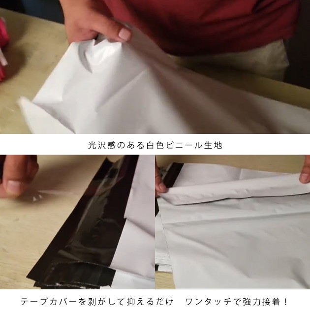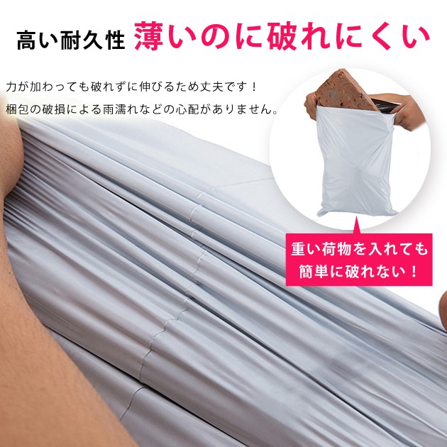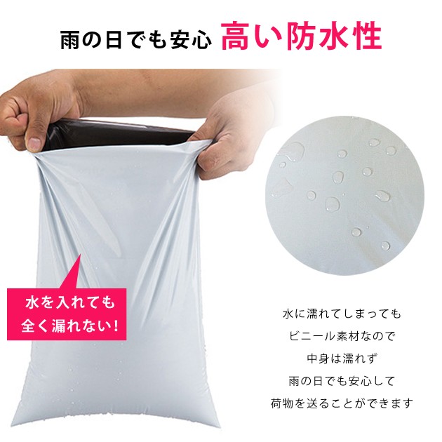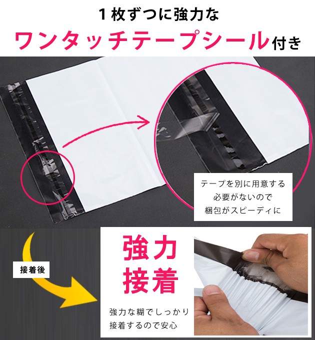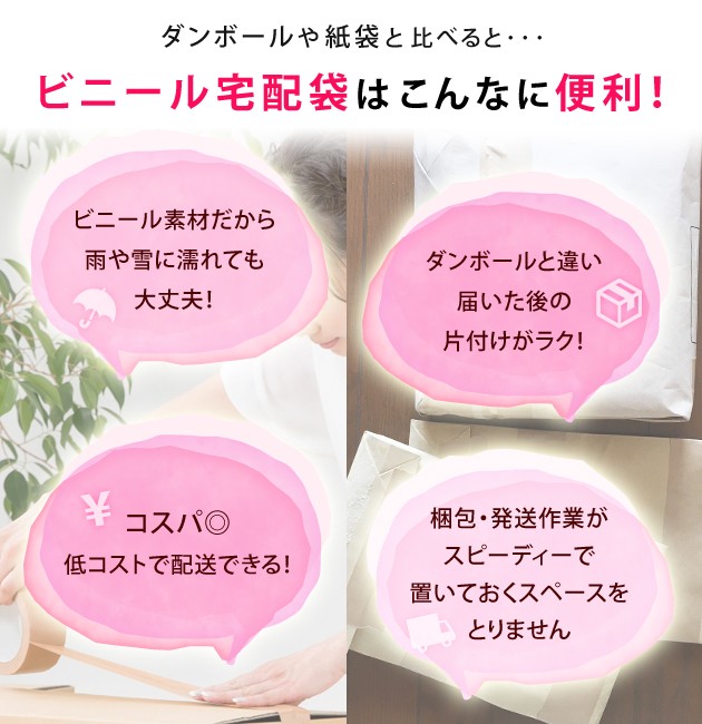 段ボールに比べて、ストックに場所を取らず梱包もスピーディ。 さらにワンタッチシール付きなので、粘着テープの用意も不要。低コストかつ作業の効率もアップします。 水に強いビニール素材なので雨や雪の日でも安心♪ 袋内側が黒いため透ける心配がありません。 |