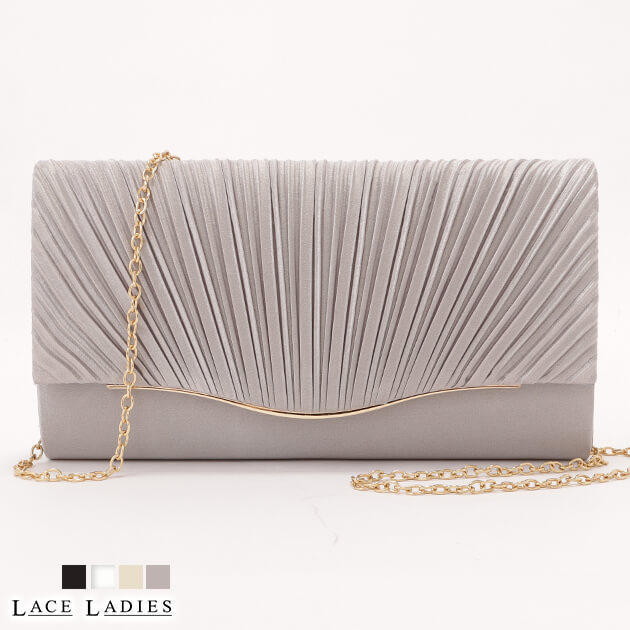 | 商品説明 | 上品な光沢感のあるパーティーバッグ。 前面は細かなプリーツにゴールドパーツのアクセントが効いたフェミニンなデザイン。 背面はシンプルに仕上げているので、レースなど繊細なドレスを着た時にも、引っ掛かりの心配はありません。 取り外し可能なチェーンストラップ付きで、クラッチバッグ、ショルダーバッグとして、シーンに合わせてご使用いただけます。 見た目はコンパクトですが、マチがあるので、必需品はしっかり収納できます。 世代を問わずお持ちいただけます◎ |