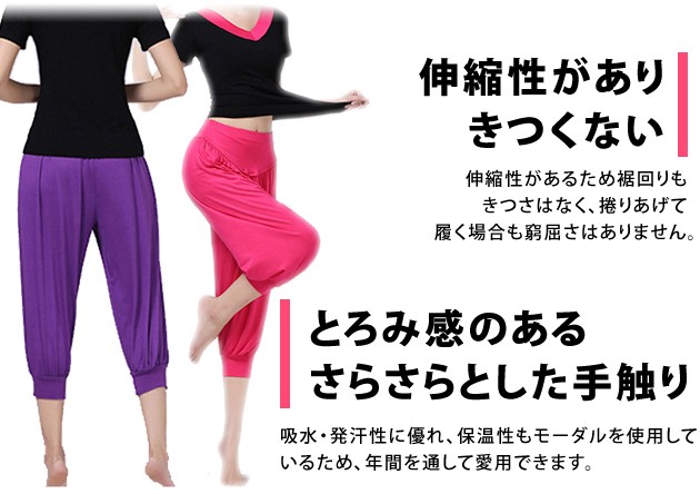 | 商品説明 | ゆったりしたシルエットのヨガパンツです! ルーズなデザインで突っ張らないため、ヨガやフィットネス、ダンスウエアとしても大活躍★ 他にもリラックスしたいルームウエアや旅行先での部屋着にも♪ 伸縮性があるため裾回りもきつさはなく、捲りあげて履く場合も窮屈さはありません。 素材はとろみ感のあるモーダルを使用。さらさらとした手触りです。 吸水・発汗性に優れ、保温性もあるため、年間を通して愛用できます。 |
