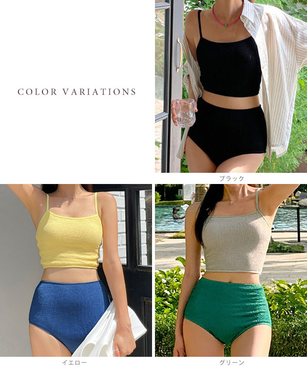 | ■商品説明 キャミソールタイプのトップスに、ハイウエストショーツをあわせたセットアップ水着。 無地ベースのシンプルなデザインが使いやすく、カジュアルな着こなしが叶う1枚です。 ニットライクな生地感が心地良い、洒落感たっぷりのアイテム。 ベーシックなオールブラックと、おしゃれなバイカラーデザインのバリエーションからお選びいただけます。 センスの良さを感じるデザインで、ビーチでの視線を集めてくれそう。 さらりとシャツを羽織るのもおすすめです。 【セット内容】 2点セット ・キャミソール ・ショーツ ■サイズの目安(cm) ※ヌードサイズ 【M】バスト:79-85、ウエスト:58-70、ヒップ:82-95 【L】バスト:85-88、ウエスト:70-78、ヒップ:92-100 【XL】バスト:88-98、ウエスト:78-92、ヒップ:100-116 ■素材 ポリエステル82%, ポリウレタン18% ■モデル情報 - ■原産国 MADE IN CHINA <ご注意事項> ・色合いはモニター環境により若干の誤差が出ます。 ・サイズは測り方により若干の誤差が出る場合がございます。2-3cmの誤差は予めご了承ください。 ・伸び縮みの有る伸縮素材の製品の為、着用可能な適合許容範囲が比較的広い特徴があります。 ・本製品は生産過程におきまして、生地を織る際の糸の継ぎ目や多少のほつれが生じることがあります。 ・柄生地は総柄の為、1点1点異なります。予めご了承下さい。 ・プールのスベリ台での摩擦は、生地を傷めます。 <お取扱方法> ・乾燥機、洗濯機、ドライヤーのご使用はお避け下さい。 ・ご使用後、海水やプールの塩素を落とす為、早めの水洗いをおすすめします。 ・ご使用後、ビニール袋に密閉し長時間放置しますと塩素等の影響で変色する可能性がございます。 ・手洗い後はバスタオルなどで押して水分を取り、直射日光は避け、陰干しをお願い致します。 |