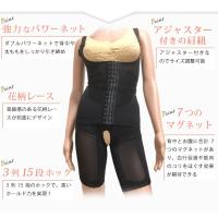 | 商品情報 | 上半身から下半身まで広い範囲をしっかりホールド!優秀ボディシェイパーです。 ・3列15段のホックで、調整がしやすい ・肩紐が太く安定してずれにくい ・背中や太ももはダブルパワーネットでしっかり引き締め ・背中とお腹に合計7つのマグネットが入っているので、血行促進や筋肉のコリをほぐす効果 |
