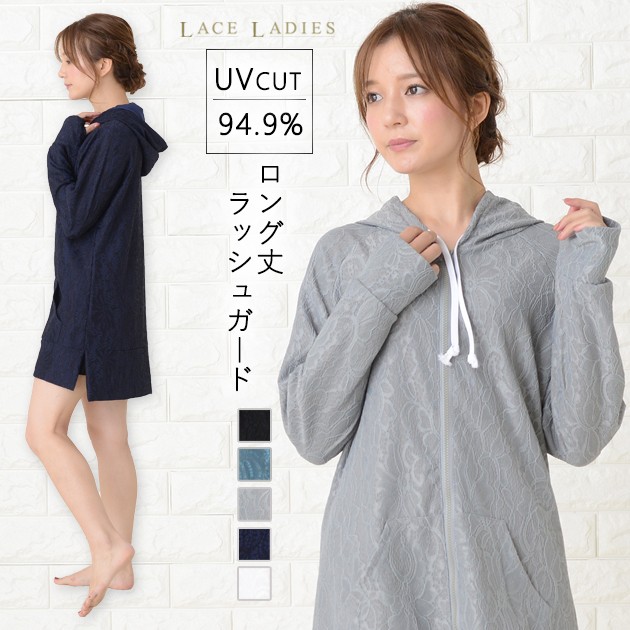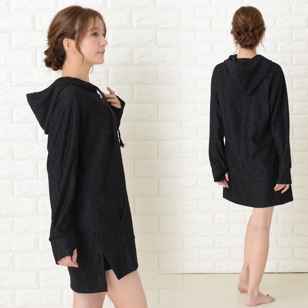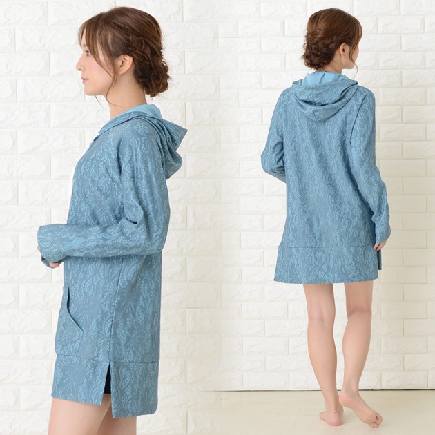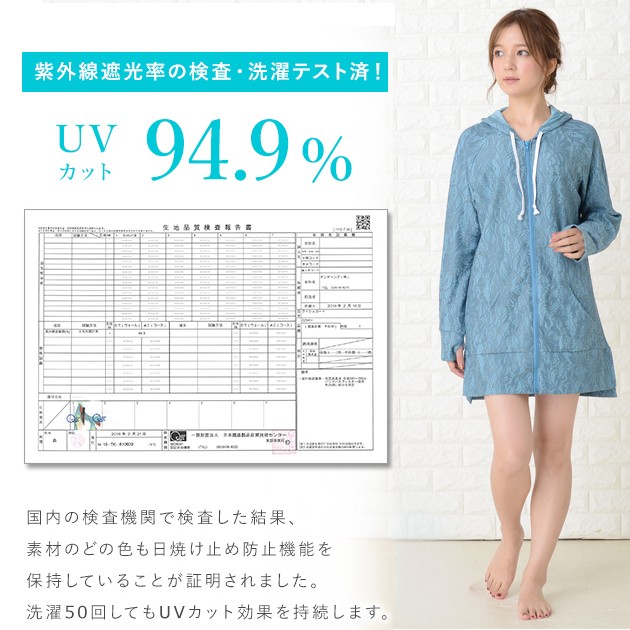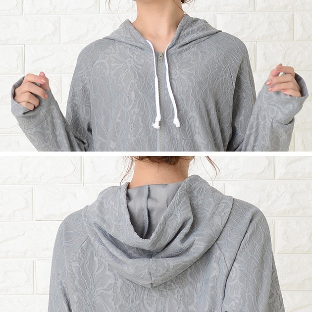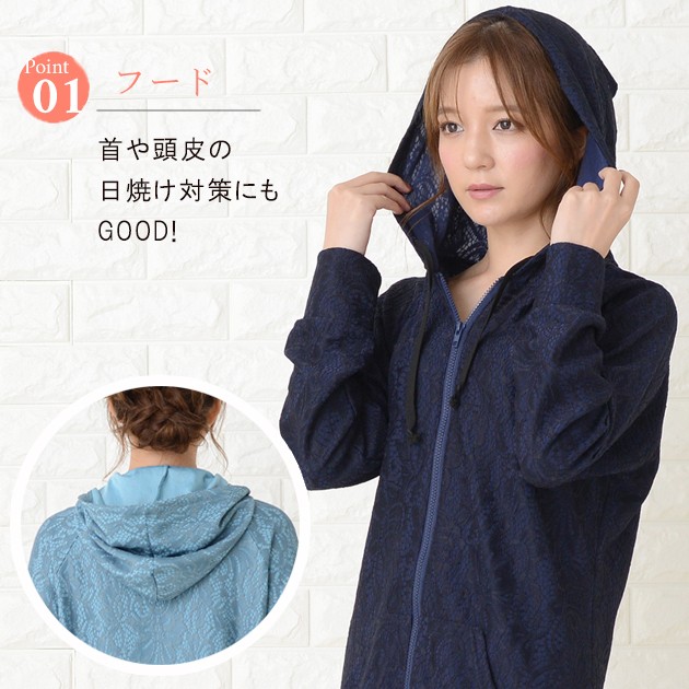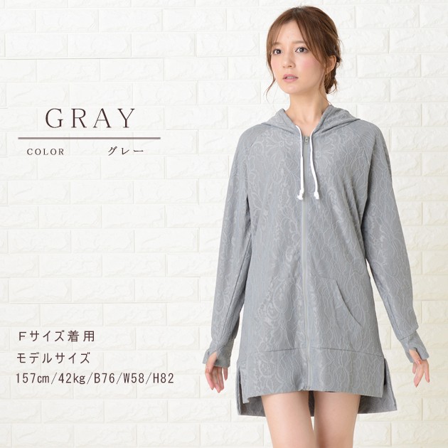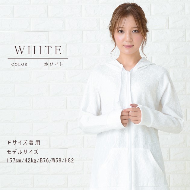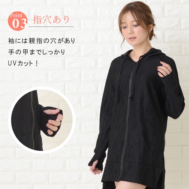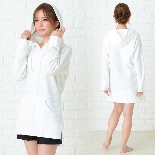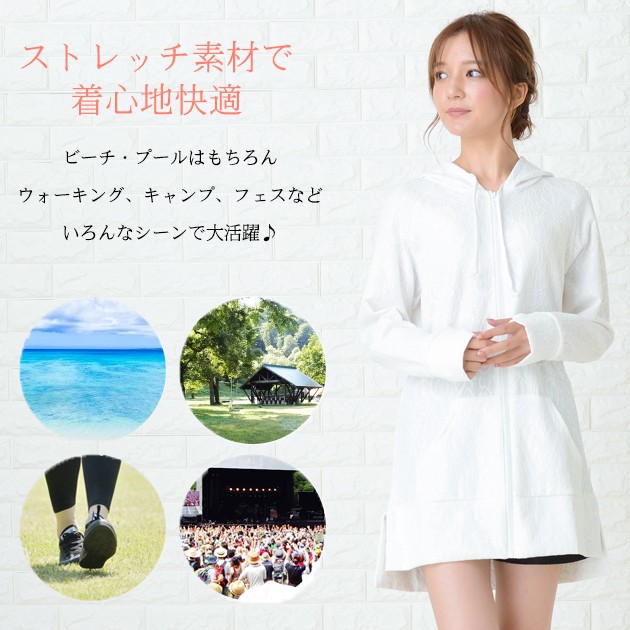 | 商品詳細 | ・フード、フロントファスナー ・指穴付き ・フロントカンガルーポケット、サイドスリット ・伸縮性あり ・紫外線カット ※ホワイトは透け感あり |