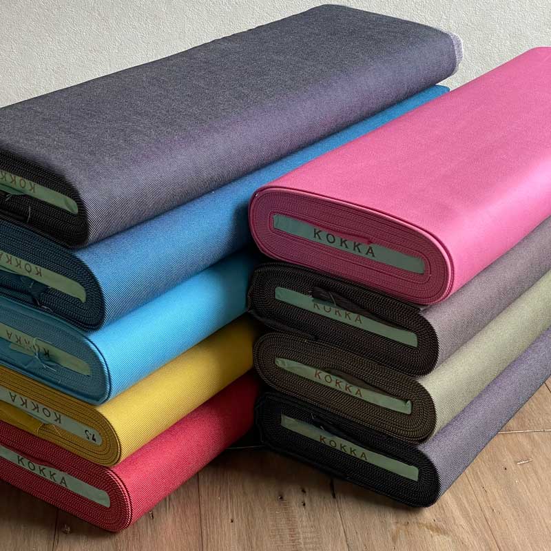 デニム風に仕上げられたツイル地は普通地〜中肉の厚みで透け感の少ない、しなやかな質感の生地です。綾織りと呼ばれる、斜めに見える織り目が特徴です。(綾織りの代表生地…デニムなど)平織りの生地に比べると、オシャレ感のある素材で、裁ち端はややほつれやすく、表面がなめらかな手触りです。オックスより少し薄手ですが、レッスンバッグやシューズバッグの表地にちょうどよい厚みです。(シーチング・ブロードなどで裏地をつける、または芯を貼った場合)