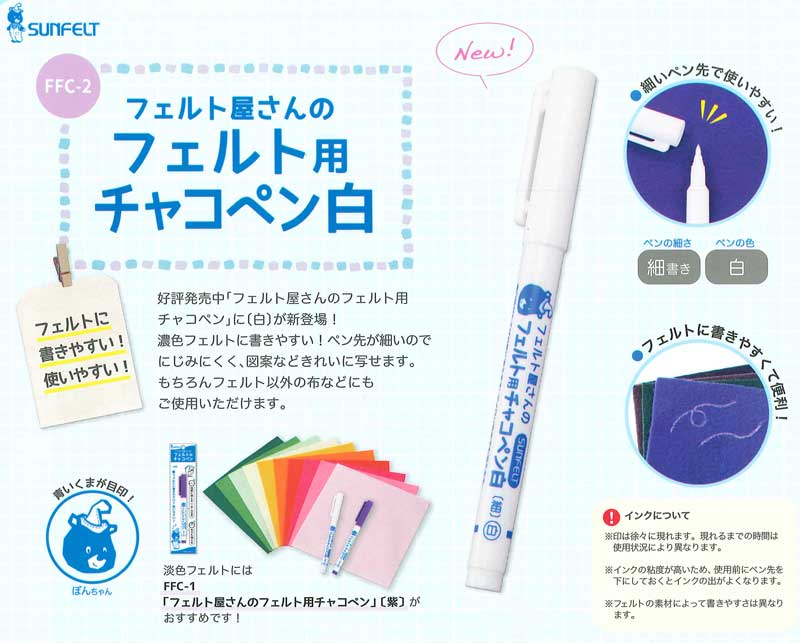 濃色フェルトに書きやすい!フェルトに書きやすくて便利に使えるフェルト用のチャコペンです。ペン先が細いのでにじみにくく、図案などがきれいに写せます。自然に消えて、水でも消せる!もちろんフェルト以外の布などにもご使用いただけます。