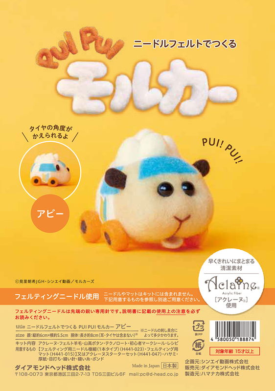TV東京系「きんだーてれび」にて大好評放送中のパペットアニメ「PUI PUI モルカー」よりニードルフェルトでモルカーをつくる「手作りキット」の第二弾です。