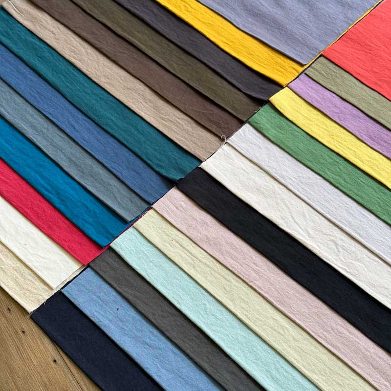 エアータンブラー加工で、ソフトな風合いで肌触りの良い、無地の綿麻シーチング生地。ナチュラルな風合いで、使い込んだようなシワ感が楽しめます。何にでも使いやすいシーチングです。ブラウス、チュニックやワンピース、パンツなどのウェアはもちろん、くったりバッグやポーチなどの小物、エプロン、クッションカバーなどのインテリアにもおすすめです。定番カラー、ビビットカラー、くすみカラーまで豊富なカラーをお楽しみください。