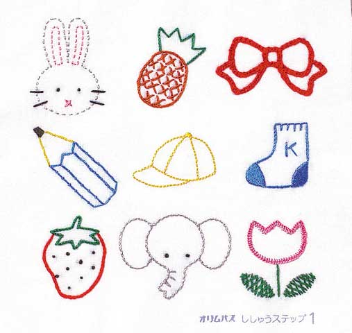 家庭科教育に必要な基本ステッチが1枚でマスターできます。ステッチ13種類使用しています。図案は布にプリント済み。ステップ1、ステッチ2、ステッチ3の順に少しずつ難しくなります。