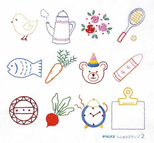 家庭科教育に必要な基本ステッチが1枚でマスターできます。ステッチ19種類使用しています。図案は布にプリント済み。ステップ1、ステッチ2、ステッチ3の順に少しずつ難しくなります。
