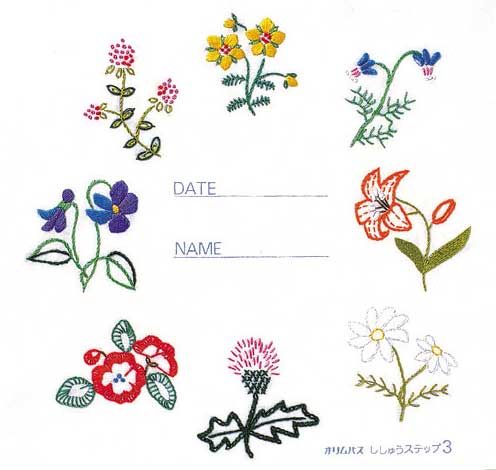 家庭科教育に必要な基本ステッチが1枚でマスターできます。ステッチ19種類使用しています。図案は布にプリント済み。ステップ1、ステッチ2、ステッチ3の順に少しずつ難しくなります。