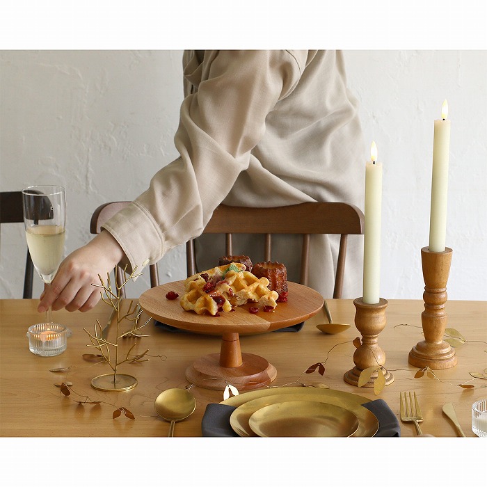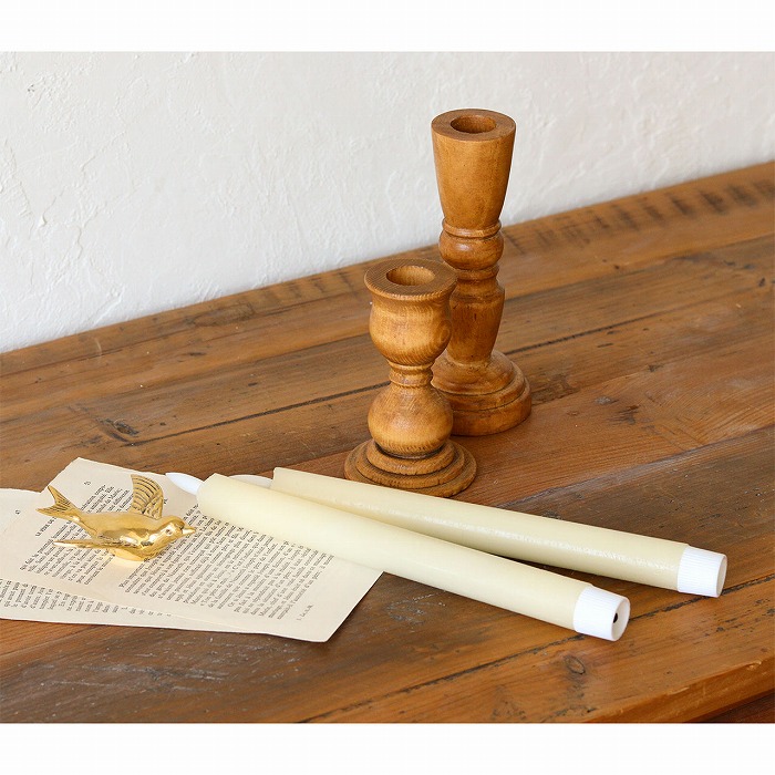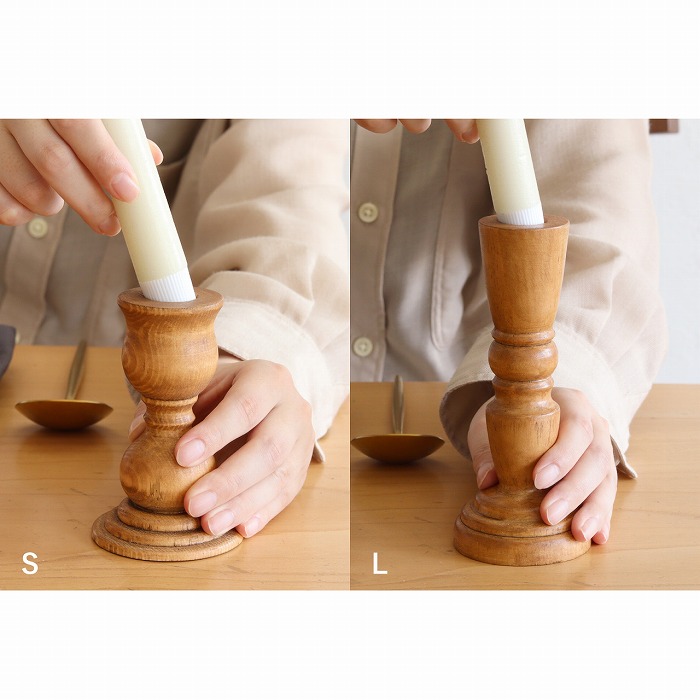 | ご注意【スタンド】 | ・スタンドに個体差があるため、キャンドルが傾く場合があります。傾く場合は付け根にアルミホイルなどを巻いてフィットさせてください。 ・天然木が主材のため、表面のざらつき、節や小さな傷、乾燥による多少のひび割れ、反り等がある場合があります。 ・パテ埋めなどの補修を施している箇所がある場合があります。予めご了承ください。 ・オイル塗装を施しておりますので、合成洗剤などの洗剤を使ったふき取りは色落ちする場合があります。お手入れは固く絞った布でふき取り頂くことをおすすめ致します。 ・ハンドメイド品のため多少のガタつきや色や形状に個体差があります。予めご了承ください。 ・ディスプレイ用の商品です。用途以外の使用をしないでください。破損、落下、転倒などの恐れがあります。 |