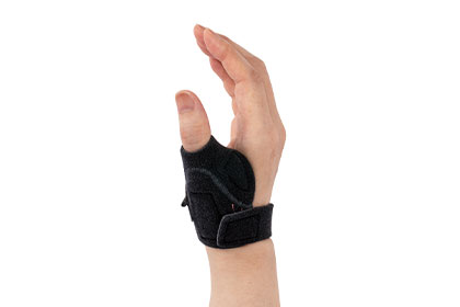 本体の立体縫製構造、内蔵のパッド・ステーによる支持、母指ストラップの締結で良肢位の保持を実現します。