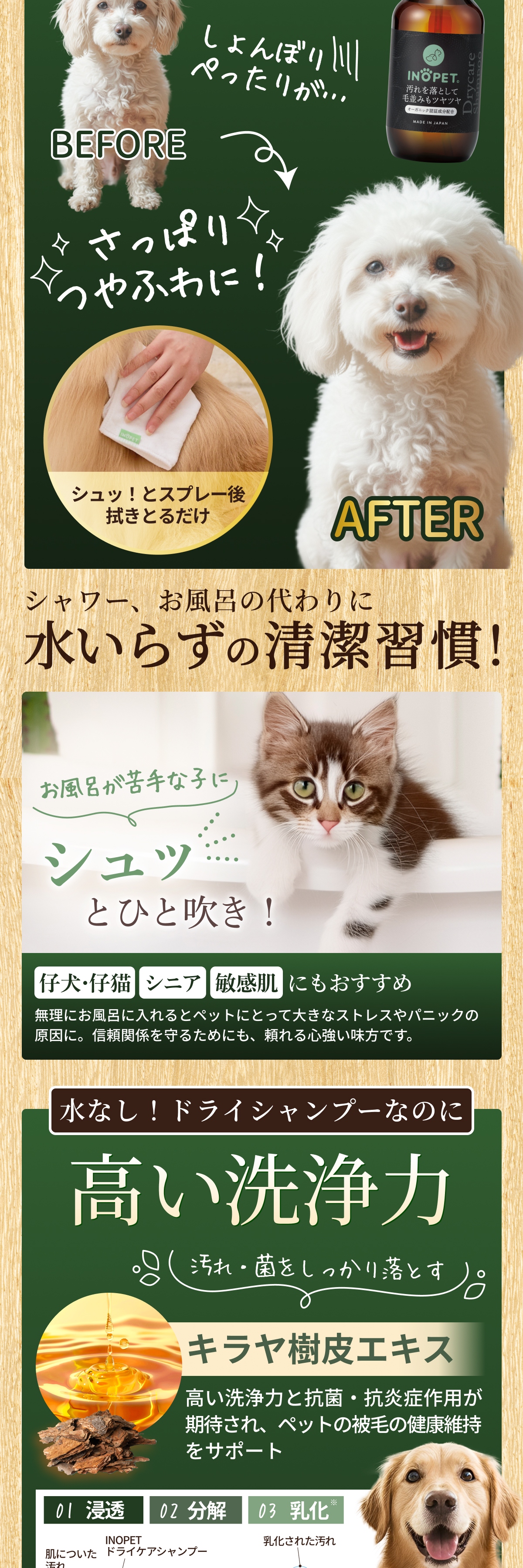 キラヤ樹皮エキスで洗い流す手間なく汚れを洗浄。カシミヤコートとアルガンオイルで傷んだ毛を修復。植物由来成分が抗菌作用に優れているため皮膚トラブルを防いでくれる