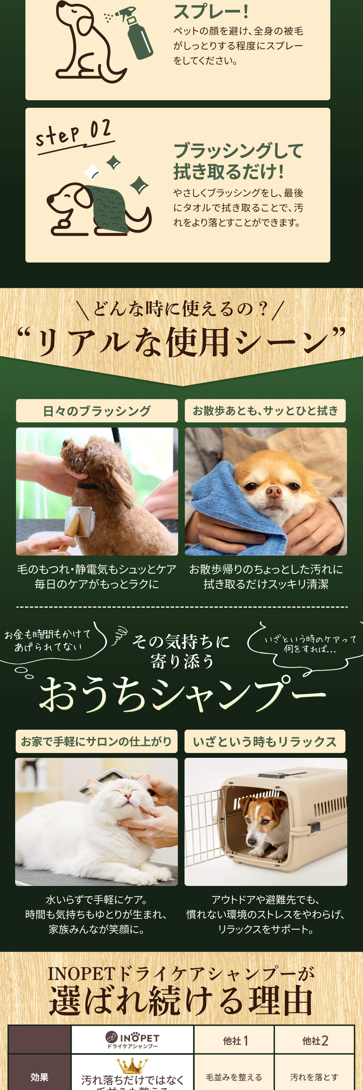 水なしで汚れ落ち毛並みケア。負担がかからずストレスフリーでずっと一緒。ブラッシングをしながらドライシャンプーをしてあげることでスキンシップが取れてもっとふたりの距離が縮まる