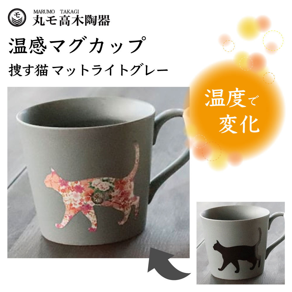 丸モ高木陶器 温感マグカップ 捜す猫 マットライトグレー 猫 猫柄 マグカップ 陶器 ネコ 温度で変化 色が変わる 猫グッズ 日本製
